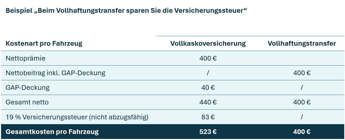 - Statt einer Versicherungsprämie für eine Firmenwagen-Versicherung zahlen Sie bei einem Haftungstransfer einen Risikobeitrag. Dieser ergibt sich – wie die Stückprämien der Versicherung – aus dem individuellen Schadenverlauf Ihrer Flotte.
