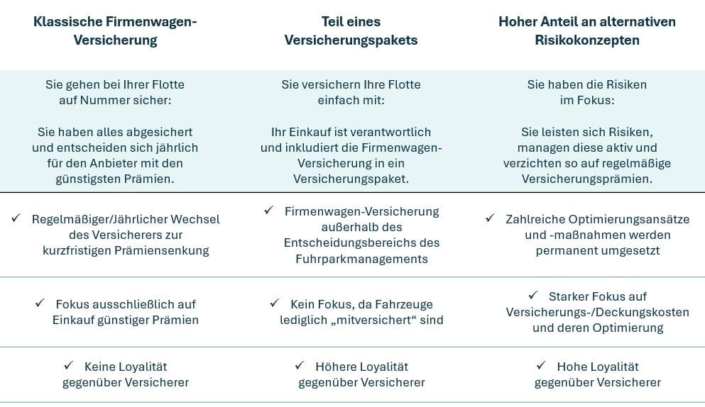 Ob Sie für die klassische Firmenwagen-Versicherung in Ihrem Unternehmen Alternativen haben, hängt davon ab, wie Sie Versicherungen in Ihrem Unternehmen insgesamt behandeln und wie aktiv Sie Ihre Fuhrparkrisiken managen.