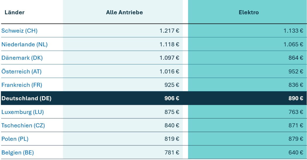 - Preisspanne von 360 €: In Portugal ist auch das Fahren eines E-Autos mit 626 € am günstigsten und in der Schweiz mit 1.133 € bzw. der Ukraine mit 1.185 € am teuersten.