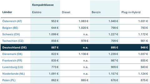 - Budgets für Fahrzeugklassen: Was kostet es in einem anderen Land im Vergleich zu Deutschland, Fahrzeuge aus bestimmten Fahrzeugklassen zu betreiben?