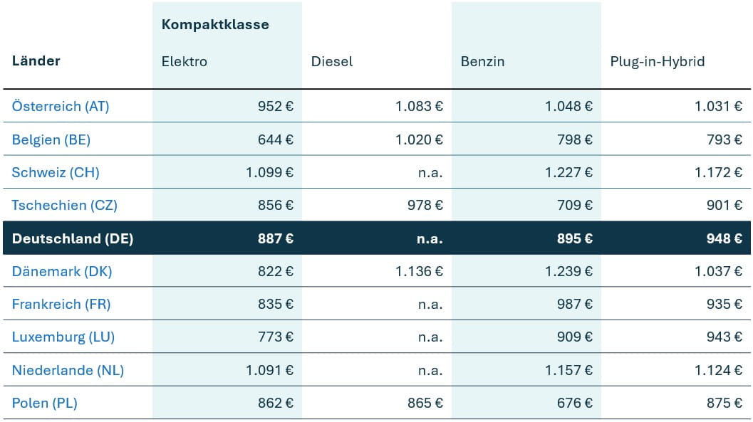 - E-Mittelklasse in 15 Ländern wettbewerbsfähig – auch in Deutschland: In der (oberen) Mittelklasse können E-Autos in der Hälfte der europäischen Länder mithalten. In Deutschland liegen die Kosten für das Fahren von E-Mittelklassewagen mit 998 € nur 4 % über denen von Benzinern mit 962 € und können damit als wettbewerbsfähig eingestuft werden.