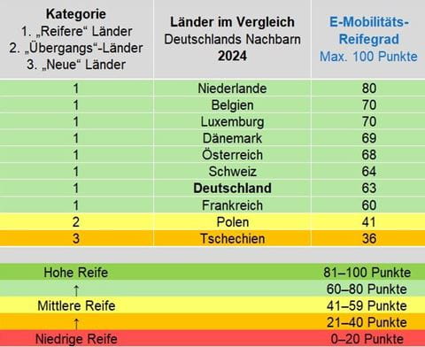 Die Schweiz auf der Überholspur Die Schweiz hat bei ihrer E-Mobilitäts-Reife gleich 10 Punkte zugelegt. So erklomm die Schweiz nicht nur die erste Kategorie der „reiferen“ Länder, sondern konnte dort sogar Deutschland überholen. Zusammen mit Polen haben sich somit gleich zwei deutsche Nachbarländer in eine höhere Kategorie entwickelt. In der Schweiz hat sich vor allem die ehemals schwache öffentliche Ladeinfrastruktur auffallend von 7 auf 12 der max. 20 Punkte gesteigert.