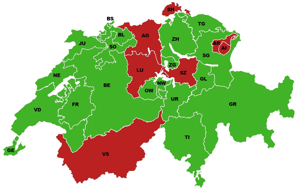 Bern, Basel-Landschaft, Basel-Stadt, Fribourg, Geneva, Glarus, Grisons, Jura, Neuchâtel, Nidwalden, Obwalden, St. Gallen, Solothurn, Ticino, Thurgau, Uri, Vaud, Zug, Zurich