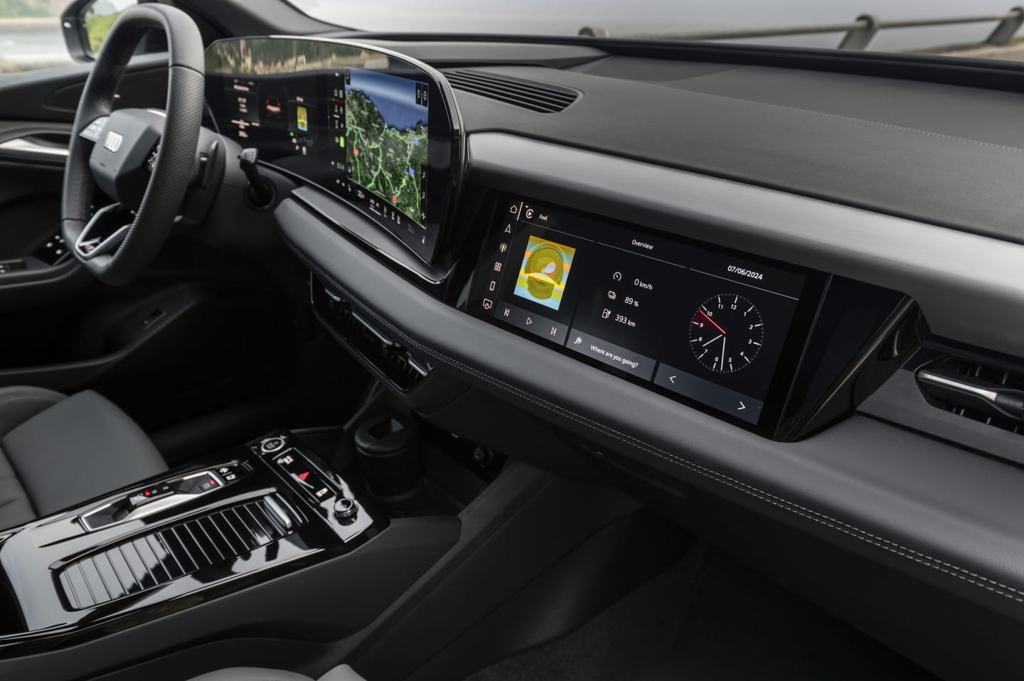 De Q6 e-tron is meteen herkenbaar als een Audi en lijkt wel een grotere Q4 of een wat kleinere Q8. Het design is dus weinig vernieuwend te noemen. Wie liever een andere look heeft kan binnenkort ook een Sportback-variant met aflopende daklijn bestellen. In het interieur is er wel een duidelijk onderscheid met zijn broers, doordat de Q6 uitpakt met twee schermen die als één gebogen geheel een ‘Panoramadisplay’ vormen en een extra exemplaar voor de passagier voorin.