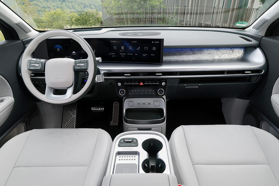 Een sportwagen is de Ioniq 9 ondanks de snelle acceleraties natuurlijk allerminst, een comfortabele reiswagen des te meer. De stoelen op de eerste en tweede rij laten zich op diverse manieren verstellen en de gigantische armsteun in het midden kan over een afstand van 20 centimeter worden verschoven. Het op een elegante manier sobere interieur straalt vooral rust uit, voor de passagiers is het mede dankzij de 3,13 meter lange wielbasis echt reizen in businessclass.
