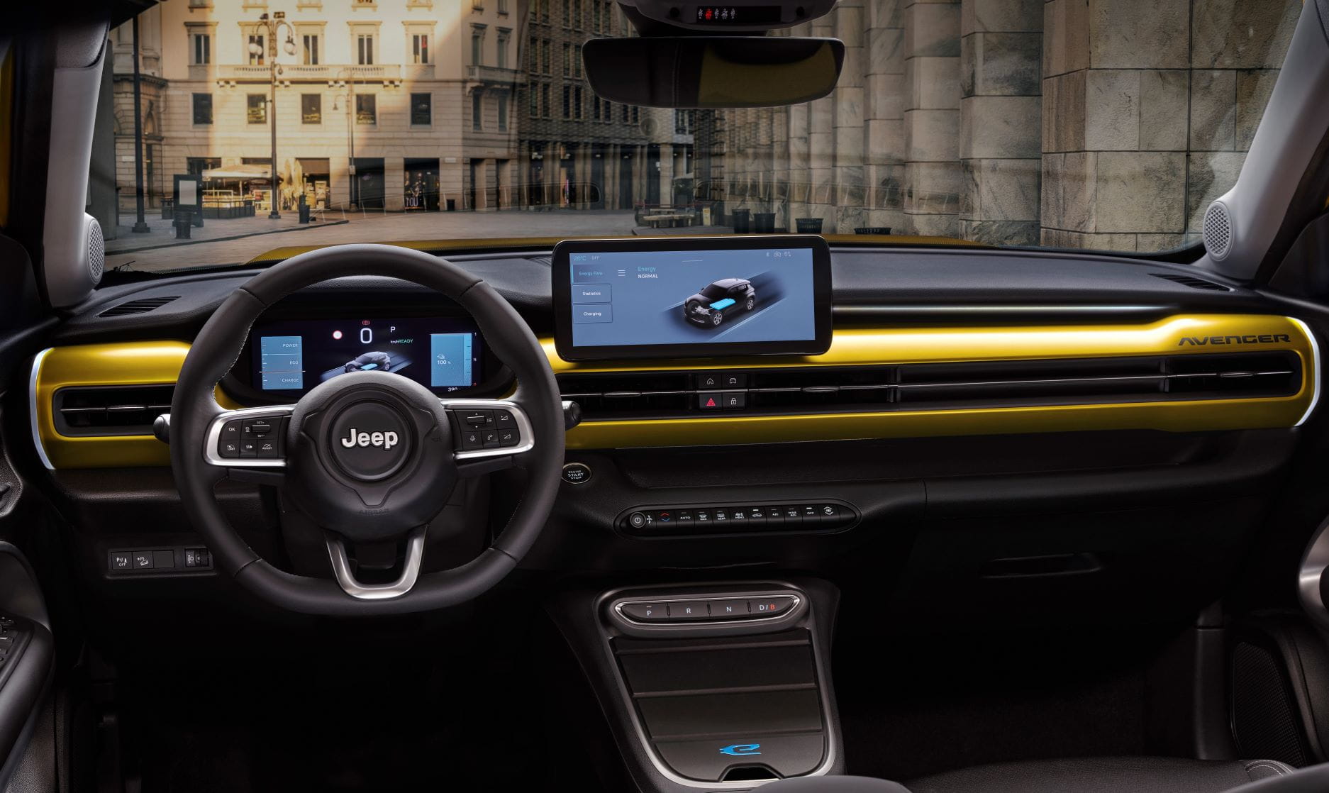 Het interieur heeft een groot dashboard dat op stuurhoogte is afgewerkt in dezelfde kleur als de auto. Daarnaast zit een digitaal instrumentenpaneel van 10,25 inch groot. Met dat systeem regel je alles: media, radio, telefoon, navigatie, airco en allerlei auto instellingen. Natuurlijk heeft de Jeep Avenger ook Apple CarPlay en Android Auto. Er is ook nagedacht over slimme opbergvakken. Tussen de ventilatieroosters en de bedieningsknoppen van het infotainment zit een groot vlak waar je wat spullen kwijt kan. Ook in de middenconsole zit een groot opbergvak.