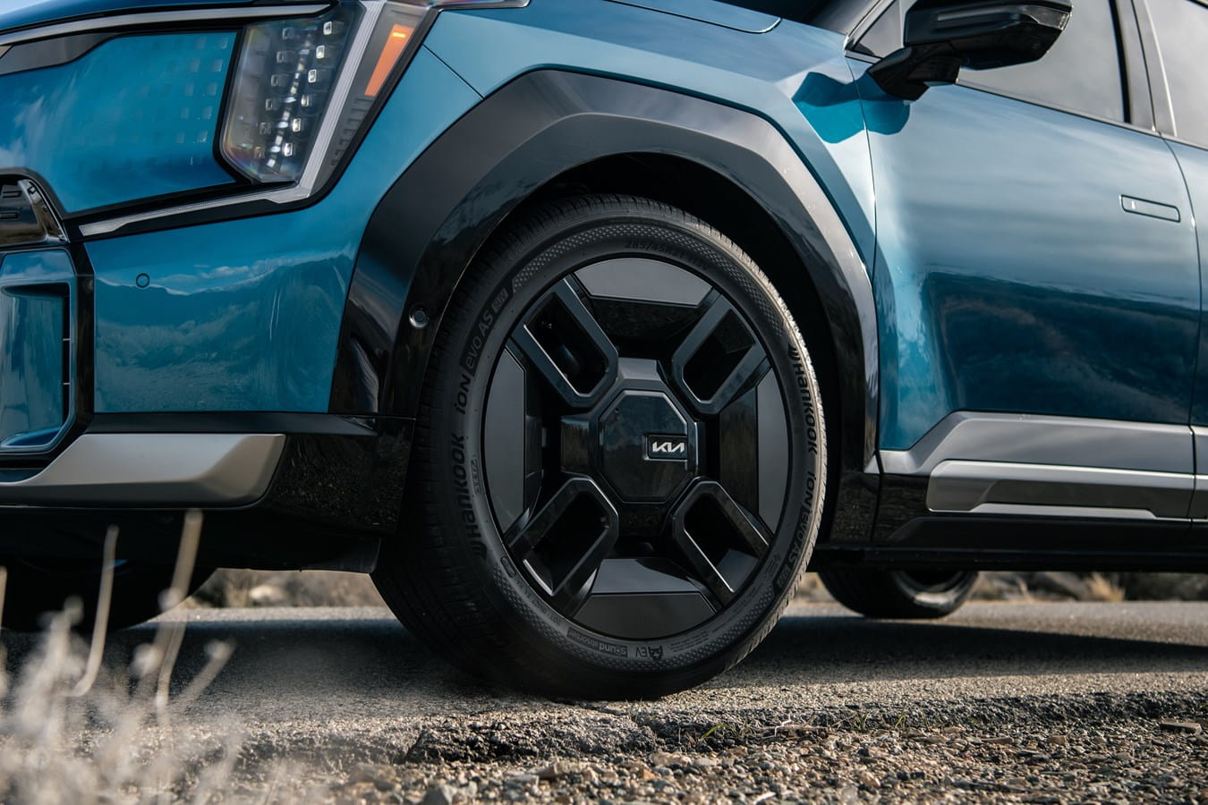 De Kia EV9 is een grote auto en heeft een wielbasis van 3,1 meter en is 5 meter lang, 1,9 meter breed en 1,8 meter hoog. Ondanks zijn grootte is de Kia EV9 ontworpen met oog voor aerodynamica. Dat komt de actieradius ten goede met 563 kilometer volgens de WLTP-norm. En dat is knap voor het voertuigsegment waarin hij valt. Net als de EV6 is ook de EV9 uitgerust met 800V-technologie, zodat hij supersnel laden. Binnen 15 minuten laadt je tot 80% van de batterij op.